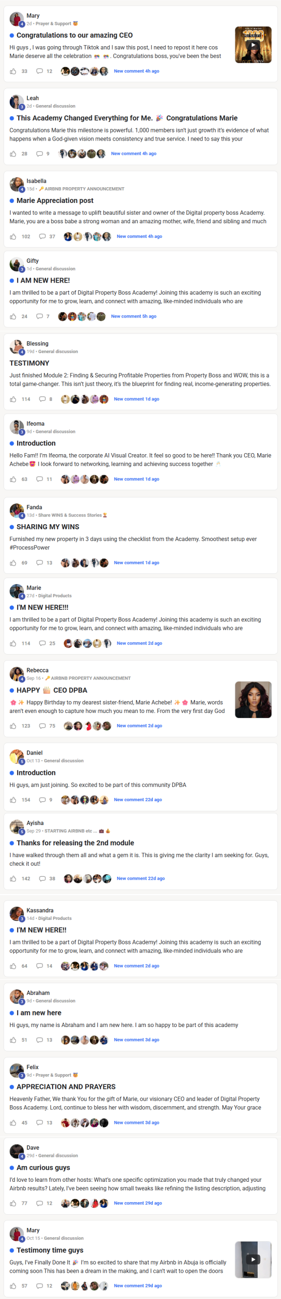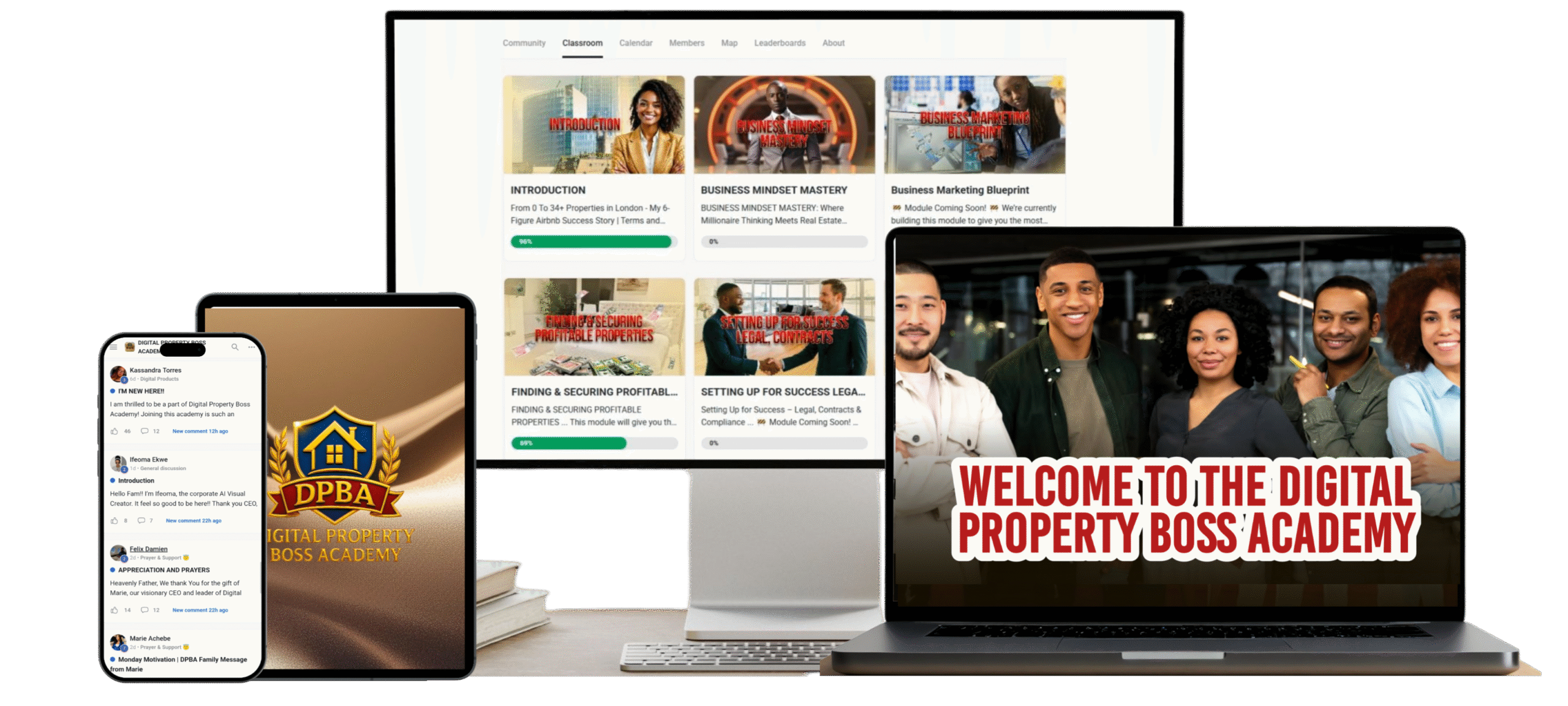 The Digital Property Boss Academy isn’t about teaching theory from textbooks. It’s about transforming everyday people into confident property entrepreneurs who generate real income through digital property strategies. We don’t just give you knowledge—we give you a complete system that works in today’s market.